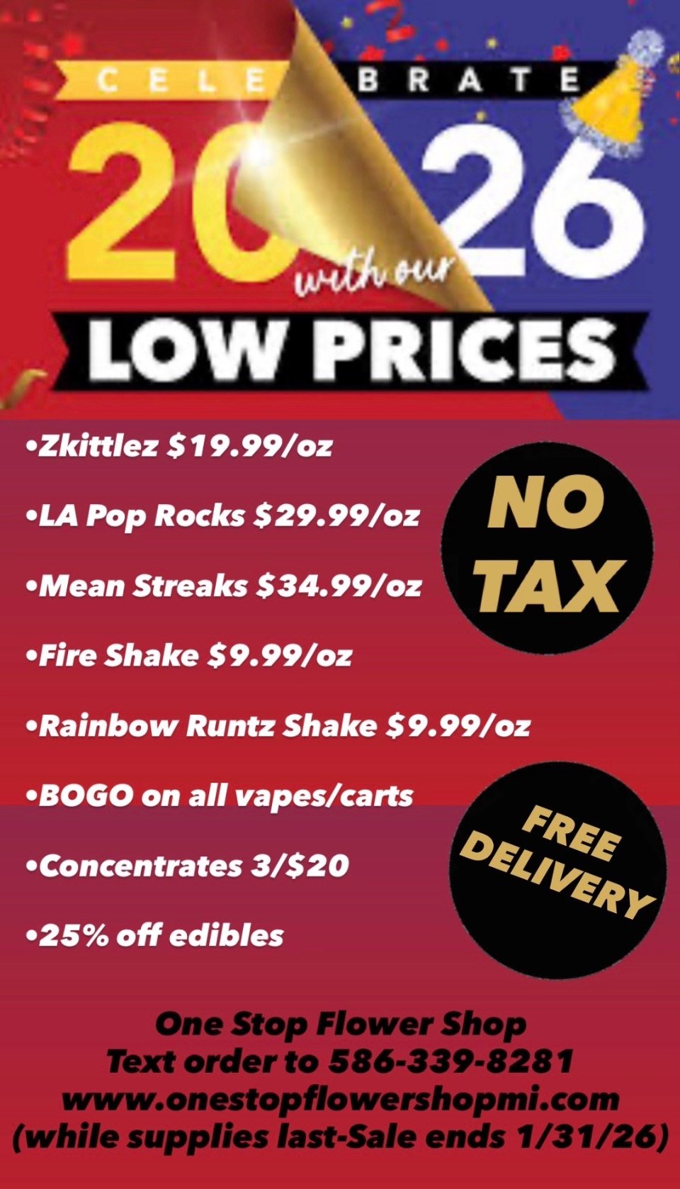 TEXT ORDER 586-339-8281First Time Patients Receive $25 off their order of $75 or more and a FREE Preroll **CHECK OUT THIS WEEKS DEALS** Home Categories: All Deals Flower Concentrates Vapes/Carts Edibles Prerolls Accessories Quick View LA Pop Rocks $60/oz Quick View Zkittlez $25/oz Quick View Mean Streaks $75/oz Quick View LM1 $5/G $20/3.5G $70/14G $125/oz Quick View Oreoz $5/G $20/3.5G $70/14G $125/oz Quick View Soap $5/G $20/3.5G $70/14G $125/oz Quick View Animal Mint Cake $5/G $20/3.5G $70/14G $125/oz Quick View Sour Diesel $5/G $20/3.5G $70/14G $125/oz Quick View Sherblato $5/G $20/3.5G $70/14G $125/oz Quick View Sharpiez $5/G $20/3.5G $70/14G $125/oz Quick View House Mix $5/G $20/3.5G $70/14G $125/oz Quick View Emerald Cut $5/G $20/3.5G $70/14G $125/oz Quick View RV $5/G $20/3.5G $70/14G $125/oz Quick View Bomb Pop $8/G $25/3.5G $80/14G $150/oz Quick View Gelonade $8/G $25/3.5G $80/14G $150/oz Quick View Sticky $8/G $25/3.5G $80/14G $150/oz Quick View London Jelly $8/G $25/3.5G $80/14G $150/oz Quick View Forbidden Fruits $8/G $25/3.5G $80/14G $150/oz Quick View Georgia Pie $8/G $25/3.5G $80/14G $150/oz Quick View Biscotti $10/G $30/3.5G $100/14G $180/oz Quick View Sour Runtz $10/G $30/3.5G $100/14G $180/oz Quick View Blue Nerds $10/G $30/3.5G $100/14G $180/oz Quick View Fire Shake $25/oz Quick View Rainbow Runtz Shake $25/oz Quick View Stickee Vapes $14 Quick View Sauce Essential Vapes $16 Quick View Sauce Reserve Vapes $22 Quick View Muha Meds Vapes $35 Quick View Diamond Vapes $25 Quick View Ripz Disposal Vapes $15 Quick View Vybe Carts $12 Quick View Ripz 1g Carts $10 Quick View Ripz Carts $15 Quick View Stickee Carts $8 Quick View Yo Dabba Badder 1g/$10 Quick View Yo Dabba Crumble $10/G Quick View Dank Gummies $4 Quick View Dope Rope $4 Quick View Sauce Bursts Gummy’s $12 Quick View Chewii Strawberry Bricks Licorice $8 Quick View Alter'd State Gummies $8 Quick View Alter’d State Nerd Gummy $8 Quick View Alter'd State Rice Krispie $8 Quick View Alter'd State Brownie $8 Quick View Fudge Brownie $8 Quick View Kool Aid $5 Quick View Infused Prerolls $3 Quick View House Cones $3 Quick View Raw Papers $2 Quick View Ooze Slim Pen Battery $10